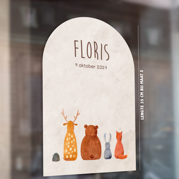 Kondig de geboorte van jullie kleintje op een bijzondere manier aan met deze schattige geboortesticker! De sticker in de vorm van een boog toont de ruggetjes van een egel, hertje, beer, haas en vosje. De lieve uitstraling van de bosdieren maakt deze raamsticker perfect voor de komst van jullie baby.