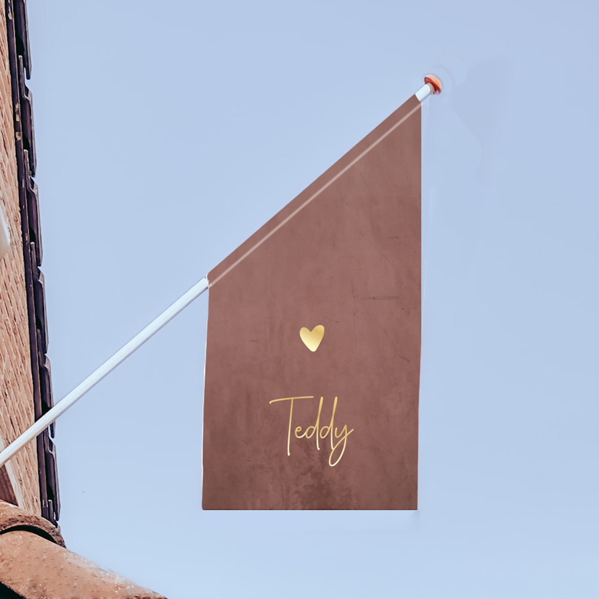 Op zoek naar een geboorte aankondiging voor buiten als de baby geboren is? Laat heel de wereld zien dat jouw baby is geboren met een hippe geboortevlag met naam in goudkleur met een hartje! Persoonlijke buitenversieiring voor de geboorte aankondiging van jullie baby shop je online bij Raambordshop!