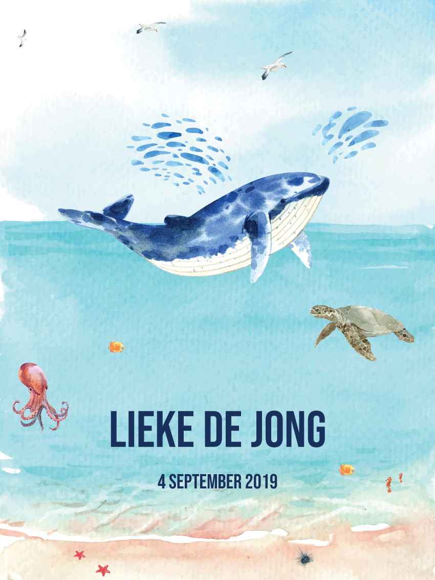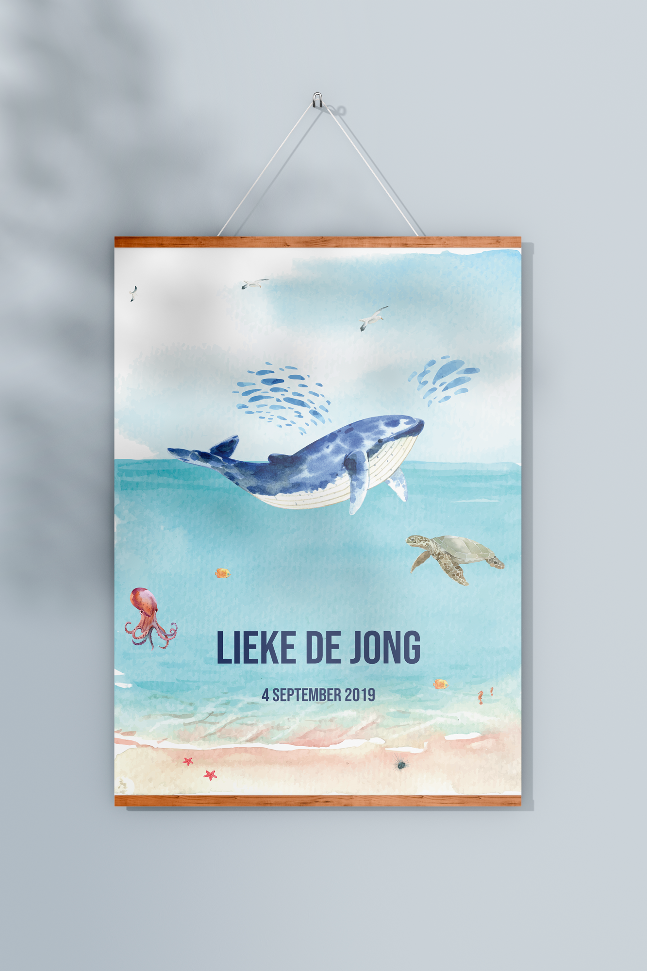 Deze geboorteposter hoort thuis in een kinderkamer of babykamer met zee thema. De gepersonaliseerde geboorteposter kun je personaliseren door middel van de naam en geboortedatum van het kind aan te passen in de velden hiernaast. Op de geboorteposter met naam en datum staat een walvis illustratie in waterverf met zeedieren en meeuwen in de lucht.